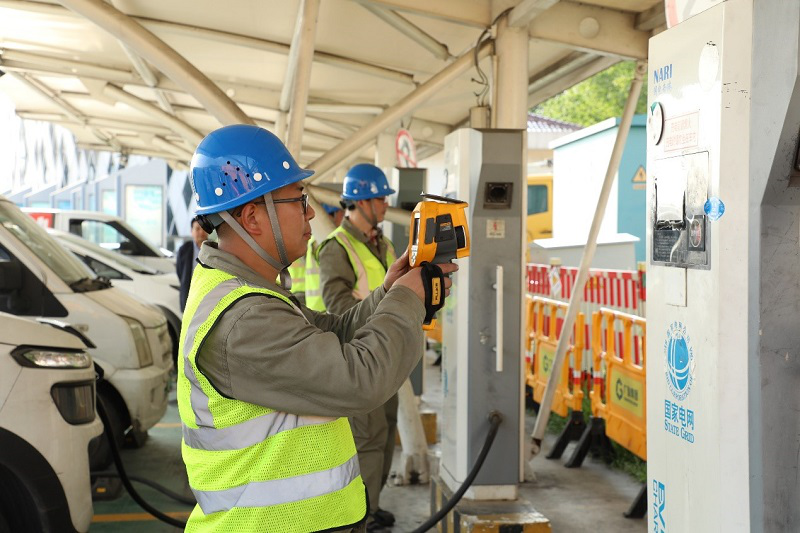 国网江苏电动汽车公司员工在宝应服务区充电站检查充电设施,全力保障市民绿色出行。