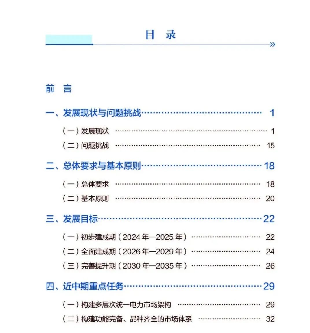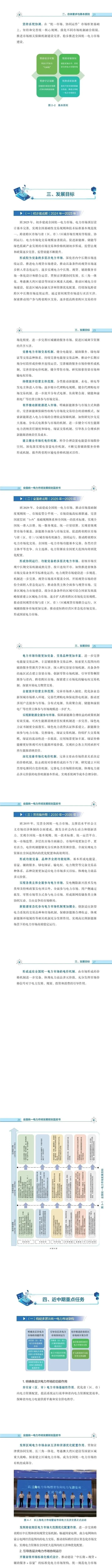 一是推动中长期交易向更长周期(多年)、更短周期(D-2)双向延伸,实现按工作日连续开市、带曲线签约、分时段结算;建立灵活高效的合同调整和转让交易机制。二是推动全国绝大多数省份在2029年前实现电力现货市场正式运行,推动南方区域电力市场在2029年前实现正式运行。三是规范辅助服务市场交易机制,探索建立一次调频、无功服务、黑启动的市场化采购机制。推动辅助服务费用规范有序传导。加快完善辅助服务与电能量市场的联合出清机制。四是深入研究中国特色的容量市场。逐步由容量电价机制向多类型主体参与的容量市场机制过渡。五是探索建设输电权、电力期货等市场。