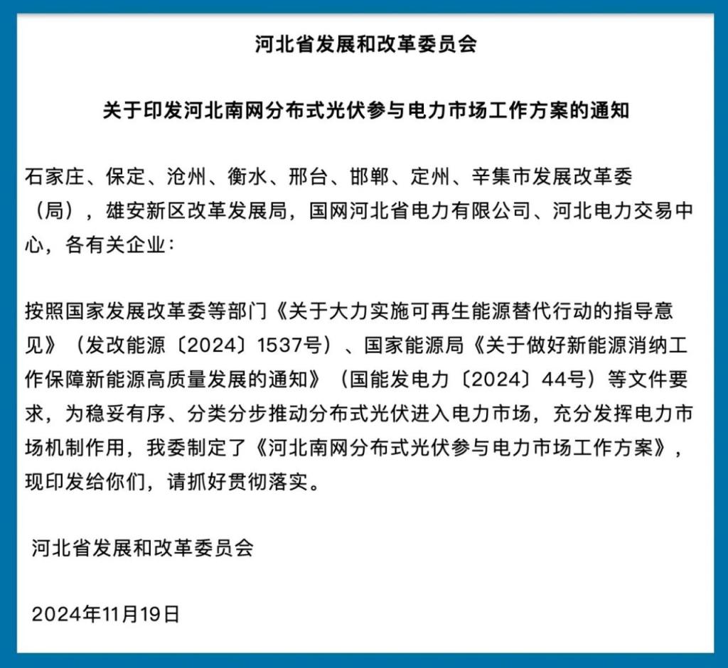 今年 11 月 19 日,河北省发改委发布《关于印发河北南网分布式光伏参与电力市场工作方案的通知》(下称《通知》)。这是迄今首份最详尽的分布式光伏入市路线图,对其后全国范围内的分布式光伏入市,具有某种揭幕意义以及重要的参考价值。