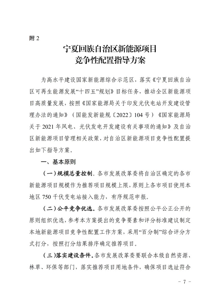 附件2《宁夏回族自治区新能源项目竞争性配置指导方案》指出,宁夏新能源项目竞配基本原则包含以下四点: