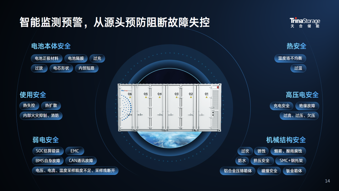 天合秉承“预防为主,精准定位、快速隔离”的防护理念,构建电芯-模组-Pack-Rack-舱-系统的多级熔断六维电气防护体系,点阵式温控系统闭环控制,实现电芯温差≤2.5℃,Pack端自研方案细化从CTP到CTR的结构调整与部件整合,车规级仿生流道设计有效隔绝热失控风险,整体结构达到IP55防护等级,搭载AI云平台赋能四级安全预警系统全时护航设备运行。