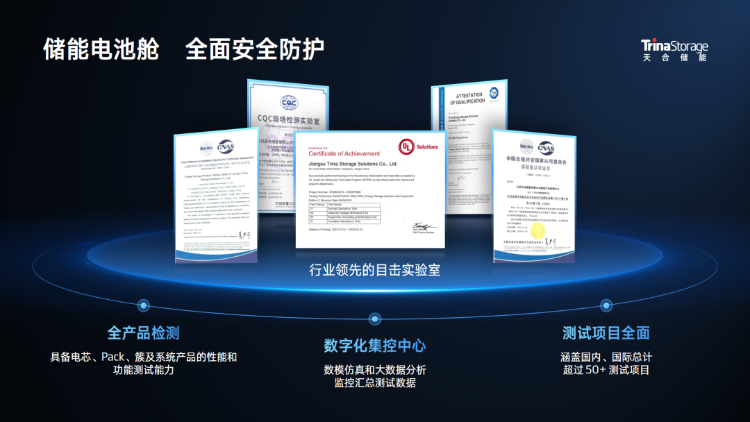 确保客户服务质量,天合始终致力于成为行业安全标杆,目前,天合储能全栈产品已通过多项全球权威认证。电池端,天合芯成为首批通过GB/T 36276-2023标准认证的储能专用电芯;Pack端,天合锂离子电池模块在冷凝水聚集、灌入冷却液和正负极喷冷却液等多项测试中指标优异,防凝露设计通过上海坦策检测技术有限公司测试;结构端,整舱通过TÜV防爆通风系统NFPA69认证,可燃气体浓度达到平均可燃下限(LFL)25%以上;系统端,Elementa2获得了全球首张储能液冷集装箱温控性能验证UL Verified Mark证书。