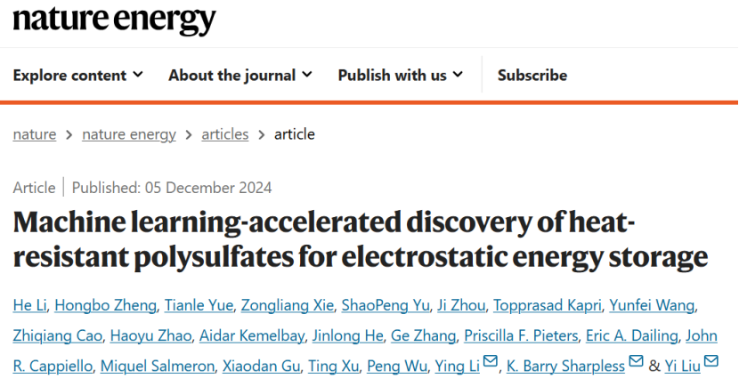日前,相关论文以《机器学习-加速发现耐热的用于静电储能的聚硫酸酯》(Machine learning-accelerated discovery of heat-resistant polysulfates for electrostatic energy storage)为题发表在 Nature Energy[1]。