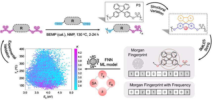 该方法将机器学习与实验验证相结合,显著缩短了材料研发周期,同时着眼于应用新一代的点击化学将研究拓展至新型、高效率合成的聚硫酸酯材料。