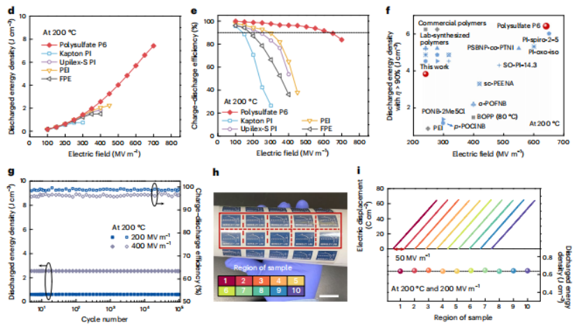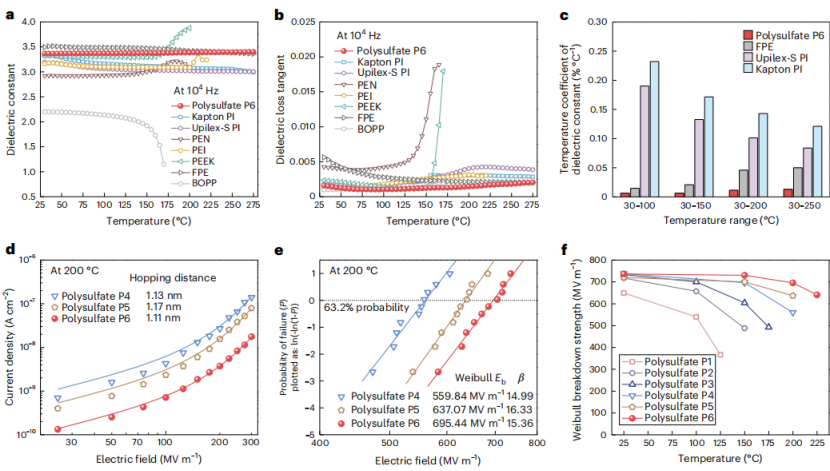 值得关注的是,新发现的聚硫酸酯 P6 表现出卓越的热稳定性和高储能密度,在 200°C 和超过 90% 的充放电效率下实现了 6.37J/cm³ 的放电储能密度。